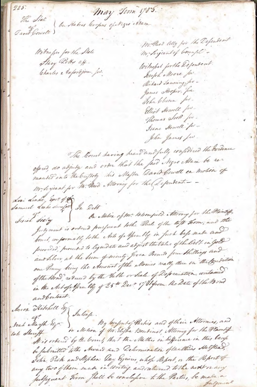 Habeas Corpus (to produce Adam, a 1783 free Negro; claimed as slave by Dr. David Cowell) Minute Book 61, p. 193; 225