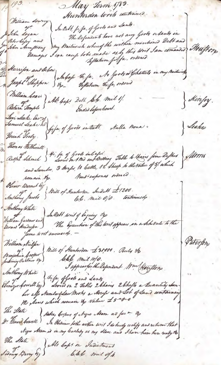New Jersey, to wit. The State of New Jersey To Dr. David Cowell — Greeting. We command you that the Body of Adam, a free negro in your Custody detained, as is said, by whatsoever name he may be called or known, together with the Day and Cause of his Taking and Detention, before our Justices of our Supreme Court of Judaiture, of Trenton, imediately after the Receipt of this writ you have, to do submit to and receive all and singular those things which our Same Justices shall then there consider of him in this Behalf, and have you then there this writ. Witness David Brearly, Esquire, our Chief Justice, at Trenton, aforesaid, the fifteenth Day of May in this Year of our Lord Seventeen Hundred and eighty three. Houston