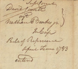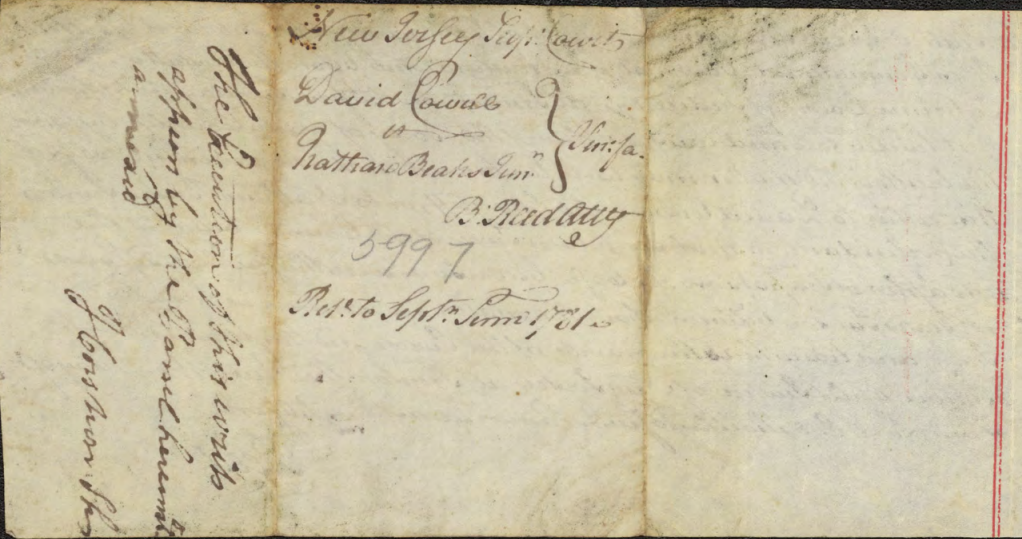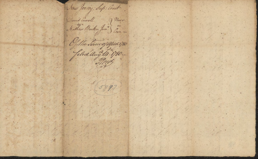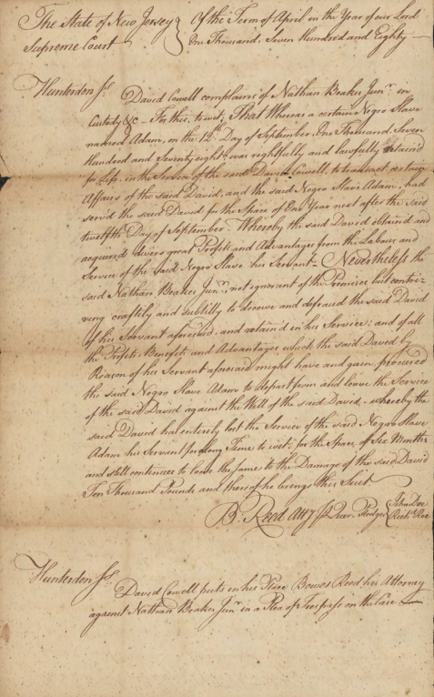 David Cowell v. Nathan Beakes Jr. Trespass on the Case (£10,000 damages; for depriving David Cowell of the service of Adam, a Negro slave). [File includes a letter dated September 1778 in which David Cowell sets forth that Adam may work for others] Hunterdon : 1780 – 1783 New Jersey State Archives Supreme Court of New Jersey Case Files, 1704 – 1844 (SSV00001)