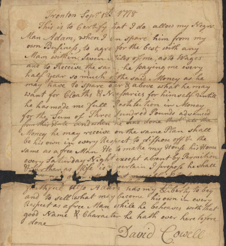 This is to Certify that I do allow my Negro Man Adam, when I can spare him from my own Business, to agree for the best, with any Man within Seven Miles of me, as to Wages and to Receive the same, he paying me every half year so much of the said Money as he may have to spare over and above what he may want for Cloaths & Necessaries for himself untill he has made me full Resitution in Money for the Sum of Three Hundred Pounds advanced from this Date and when he has done that all the Money he may receive on the same Plan shall be his own in every Respect to dispose off & the same &c the same as a free man. He to make my House his Home every Saturday Night except absent by Permission & [?] as life is certain. I propose he shall [?] faithful. Also Adam has my Liberty to buy and sell what may become his own in every Respect as a free Man while he beheaves with that good Name & Character he hath ever here tofore done David Cowell