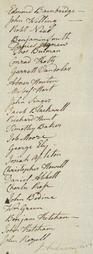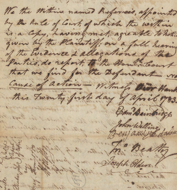 We the Witnesses named Referees, appointed by the Rule of Court, of which the witness is a copy, having met, agreable to notice given by the Plaintiff; on a full hearing of the Evidence & allegations of the parties, do report, to the honble Court that we find for the Defendant – No Cause of Action – Witness their Hands this Twenty first day of April 1783