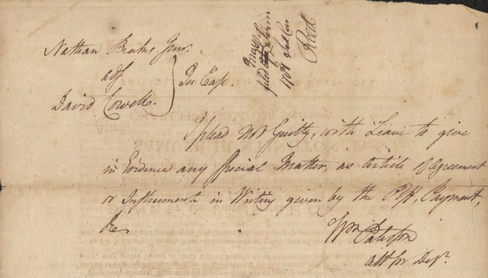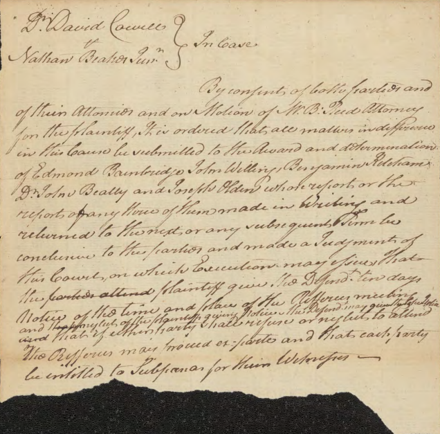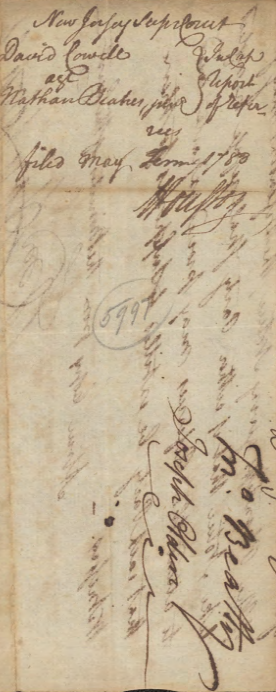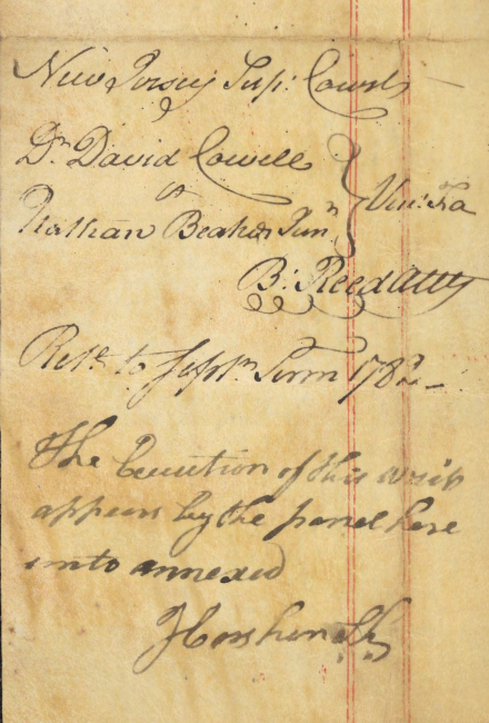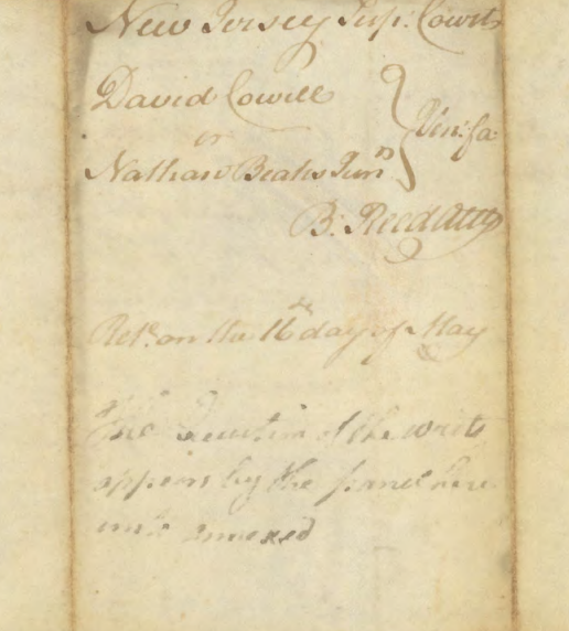 New Jersey Js: The State of New Jersey To The Sheriff of the County of Hunterdon Greeting It is Commanded you that You cause to come before New Justices of the Supreme Court of Judiciature at Trenton on the Fourth Tuesday in September next twelve free and lawful Men of the Body of your County, by whom the truth may be the better known and who are in noways of kin either to Dr. David Cowell the Plaintiff or to Nathan Beakes Junr Defendant, to make a certain Jury of the County between the parties aforesd of a plea of Trespass on this Case because as will the said Dr David Cowell as the said Nathan Beakes Junr between whom the matter in Varience is have said themselves on that Jury, And have there then the Names of those Jurors and the Writ, Witness David Brearly Esqr Chief Justice of Trenton the Twentieth Day of May in the Year of our Lord One Thousand Seven Hundred and Eighty Two. B: Reed Atty