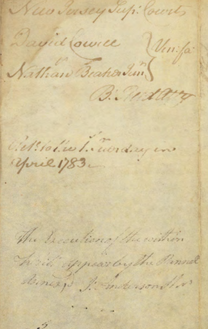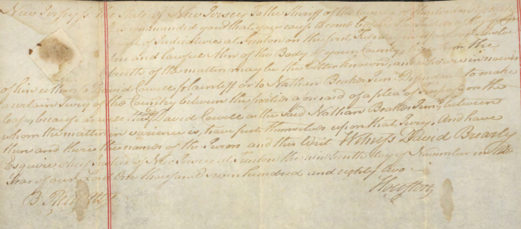 New Jersey Js: The State of New Jersey To The Sheriff of the County of Hunterdon Greeting It is Commanded you that You cause to come before New Justices of the Supreme Court of Judiciature at Trenton on the first Tuesday in April next twelve free and lawful Men of the Body of your County, by whom the truth of the matter may be the better known, and who are in noways of kin either to David Cowell plaintiff or to Nathan Beakes Junior Defendant to make a certain Jury of the County between the parties aforesaid of a plea of Trespass on the Case, because as will the sd David Cowell as the said Nathan Beakes Junr, between whom the matter in valence is, have put themselves up on that Jury, and have then and have the names of the Jurors and the Writ Witness, David Brearly Esquire Chief Justice of New Jersey at Trenton the nineteenth day of November in the Year of our Lord One Thousand Seven Hundred and eighty two