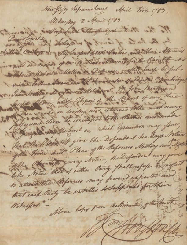 By Consent of both parties used their Attornies and on matters of Mr B. Reed Attorney for the Plaintiff it is ordered that all Matters in difference this Cause be Submitted to the Award and Determination of Edmond Bainbridge, John Willery, Benjamin Ketcham Dr. John Beatty and Joseph Olden, whose Report in the Report of any three and then make in writing and returned to the next or any subsequent Term be conclusive to the Parties and make a Judgement of the Court on which Execution may issue that the Plaintiff give the Defendant ten days Notice of the Time and Place of the Referees Meeting and on [?] of the Plaintiffs giving notice, the defendant may give like Notice that if either party shall refuse or neglect to attend the Referees may proceed exparte and that each Party be entitled to Subpenas for their Witnesses. – A true copy from the Minutes of the Court Wm Houston