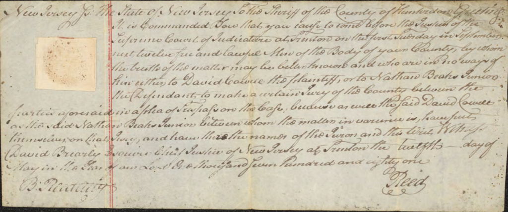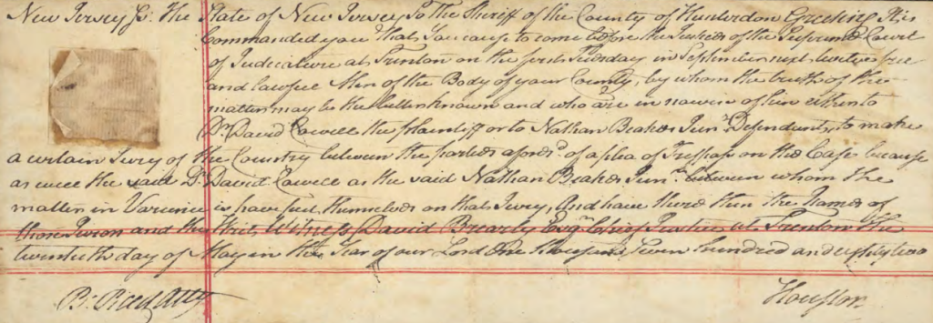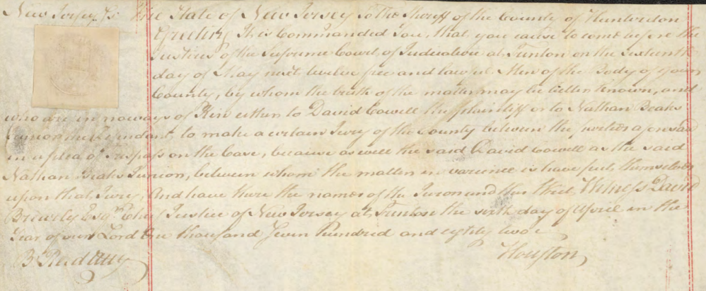 New Jersey JS: The State of New Jersey to the Sheriff of the County of Hunterdon Greeting It is Commanded You that you cause to come before this Justices of the Supreme Court of Judiciature at Trenton on the First Sunday in September next twelve free and lawful Men of this Body of your County, by whom the truth of the matter may be better known and who are in 110 ways of hire either to David Cowell the plaintiff, or to Nathan Beakes Junior the Defendant, to make a certain Jury of this County between the parties aforesaid in a plea of Trespass on this Case, because as well the said David Cowell as the said Nathan Beakes Junior between whom the matter in variance is, have put themselves on that Jury, and have there [sic] the names of the Jurors and this writ Witness David Brearly Esquire Chief Justice of New Jersey at Trenton the Twelfth day of May in the Year of our Lord One Thousand Seven Hundred and eighty one